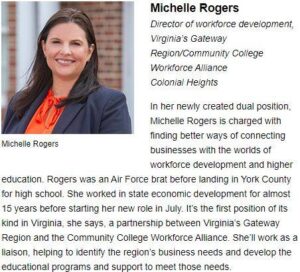 In December, VGR congratulated Michelle Rogers for making Virginia Business Magazine’s “100 People to Meet: Rainmakers” 2020 edition for her newly created, first-of-its-kind dual position with VGR and the Community College Workforce Alliance (CCWA), a partnership of John Tyler Community College.